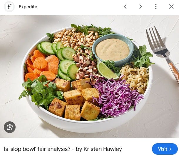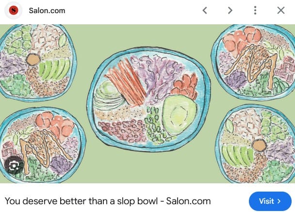 Anyways, a small question: when did "slop bowl" become such a prevalent term? Am I the last American my age to discover these words can be packaged in this order and easily understood by my peers? I've actively limited my time on social media, which has done wonders for my mental health, but I wouldn't think I'm so disconnected from the culture so as to miss on something this commonplace. I mean, look at all these hoity toity articles.