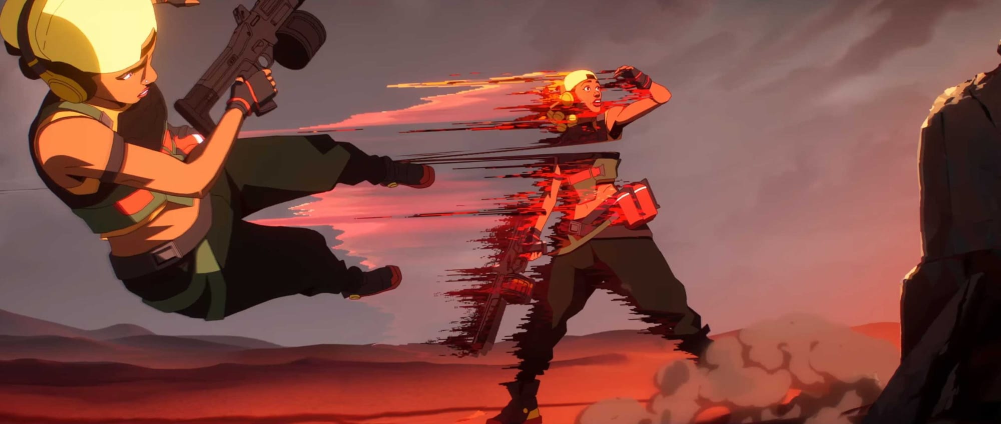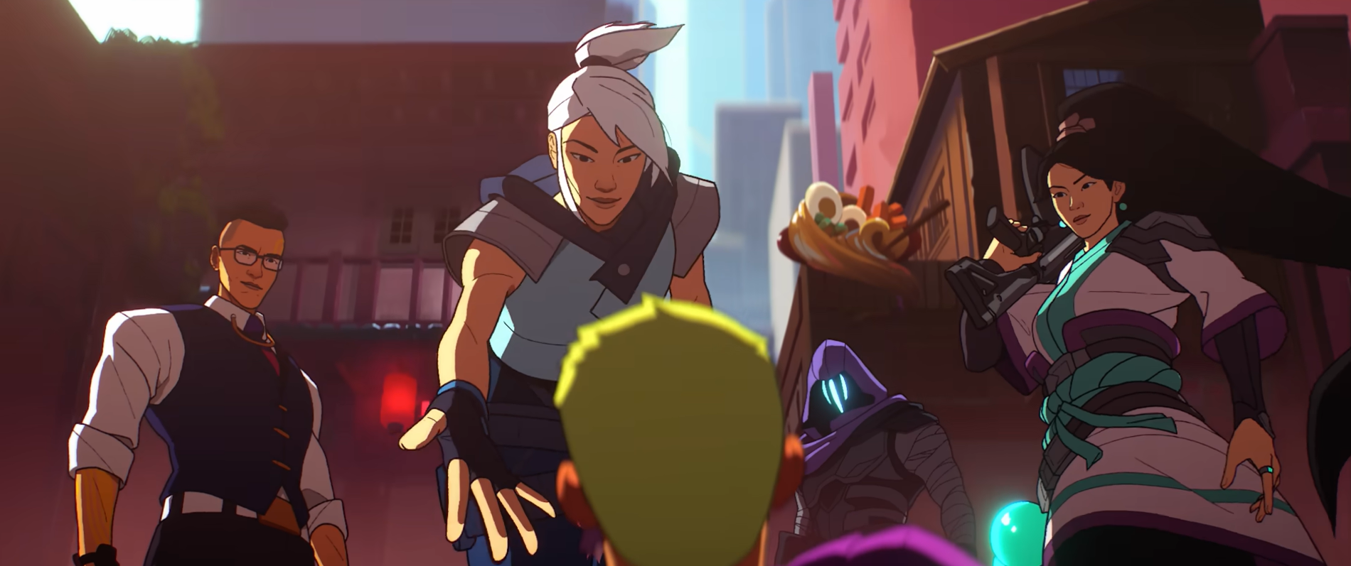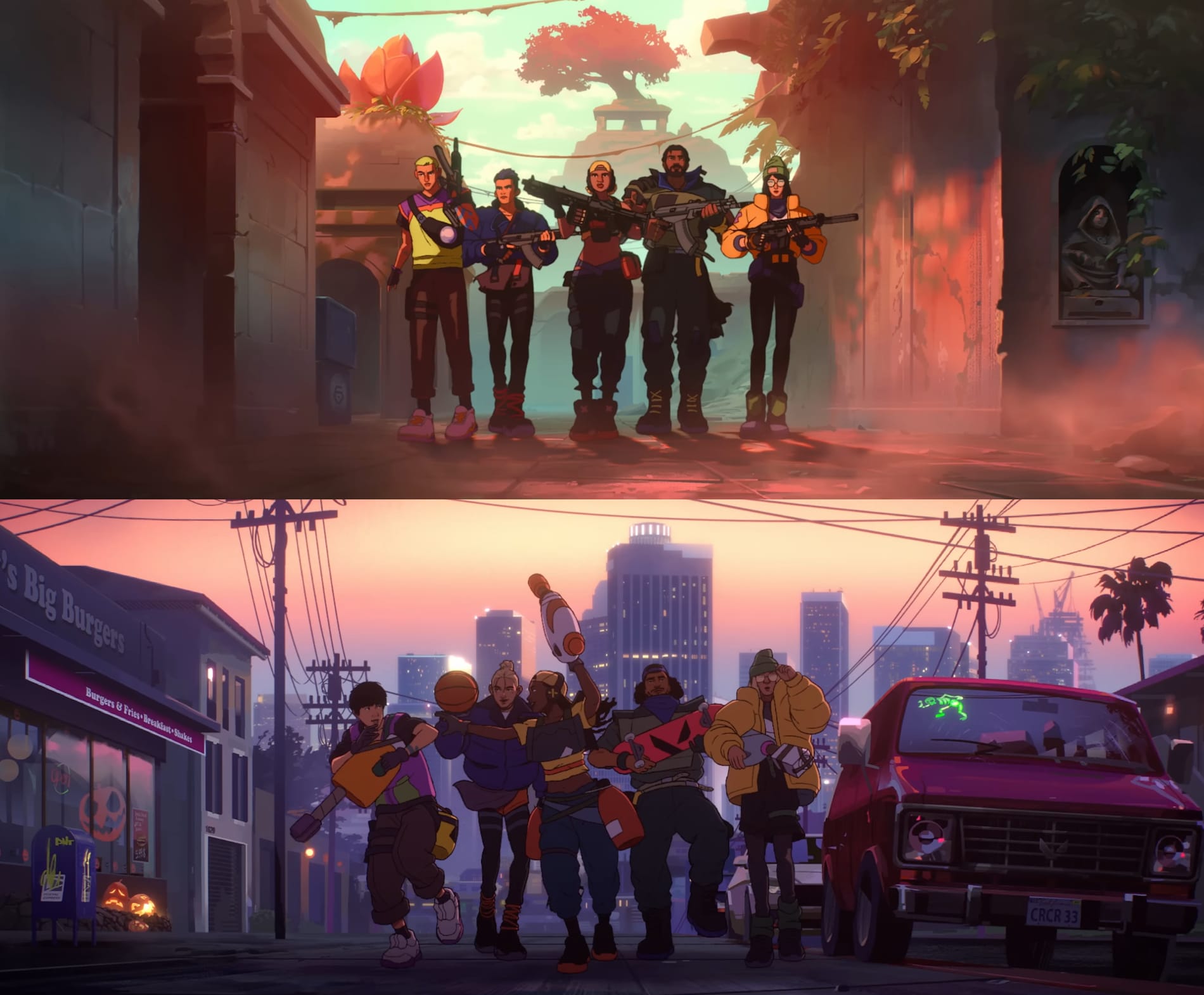 There's no straightforward plot here, but 2022's "Fire Again" features new agents and pro player cameos to personify the song's colors of defiance and resilience. Vibrant palettes and glitch-like effects complement the electronic BGM. Even though intense effort was clearly put into designing the backgrounds, the camera rightfully focuses on a smooth transition between fictional agents and their respective real-life players. The video ends on the players who, despite the adversity thrown at them in the life, pick themselves up and run into the light.